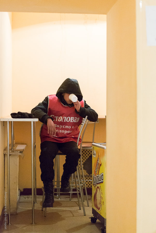 Scen från en enkel men trevlig restaurang (eller ”matsal”, столовая), som jag besökte ett par gånger under en kylig vårvecka. Den här killen brukade stå i blåsten utanför porten och locka in nya gäster. Han måste ha njutit av sitt kaffe (eller om det var te).